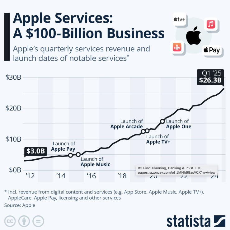 Apple's services division, which includes Apple Pay, Apple Music, Apple TV+ and the App Store - among others - reached an all-time revenue high in the first quarter of fiscal year 2025. Apple’s quarterly services revenue climbed to $26.3 billion in the three months ended December 28, up from $12.7 billion five years ago.