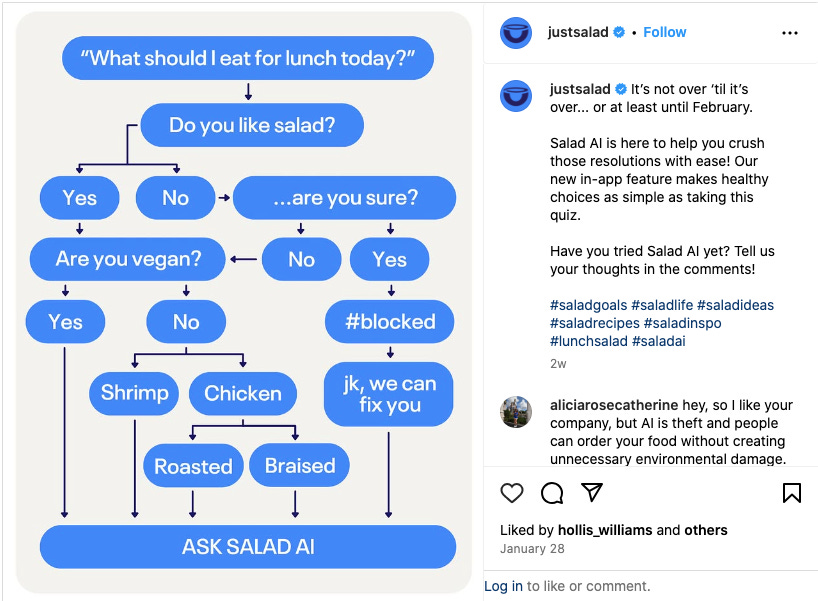 Just Salad is serving up a new recipe for customer satisfaction with Salad AI, a tool that takes the guesswork out of ordering a customized salad. Acting as a thoughtful personal chef, it inquires about the user's dietary preferences, nutritional goals and flavor cravings through a simple survey in the brand's mobile app.