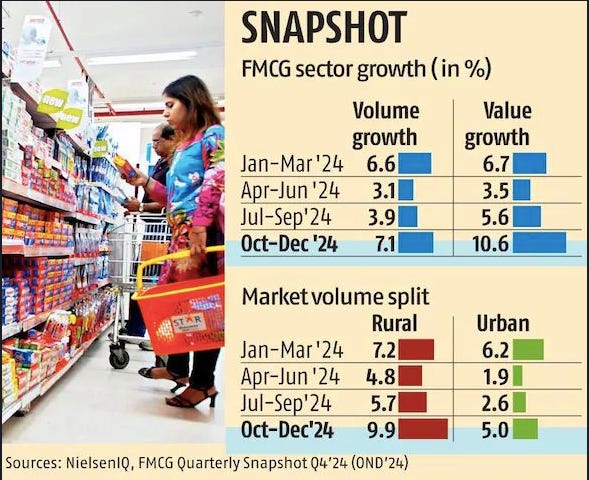 India’s FMCG sector reported a 7.1% YoY growth in volume terms for the quarter ending Dec’24, as per NielsenIQ against the year-ago quarter’s increase of 6.4% - the best quarter in the past year !